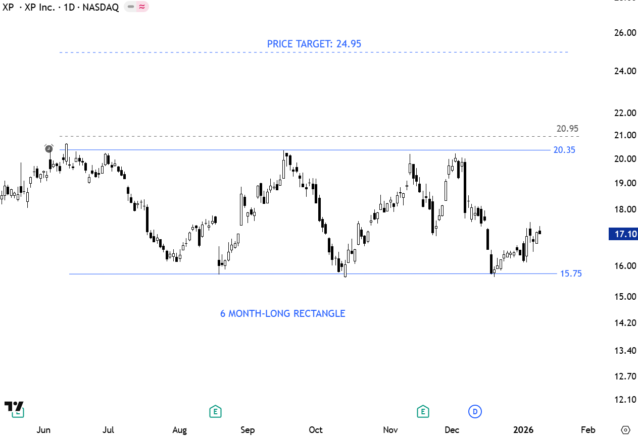 XP, Inc. engages in the operation of technology-driven financial services platform. The firm provides customers with two principal types of offerings, financial advisory services for retail clients in Brazil, high-net-worth clients, international clients and corporate and institutional clients, and an open financial product platform providing access to over 800 investment products including equity and fixed income securities, mutual and hedge funds, structured products, life insurance, pension plans, real-estate investment funds (REITs) and others from XP, its partners and competitors. The stock is listed on the Nasdaq Stock Exchange. Price chart formed a 6 month-long rectangle with the upper boundary acting as resistance at 20.35 levels. A daily close above 20.95 levels will confirm the breakout with the possible chart pattern price target of 24.95 levels. (Learn more: Video Tutorial)