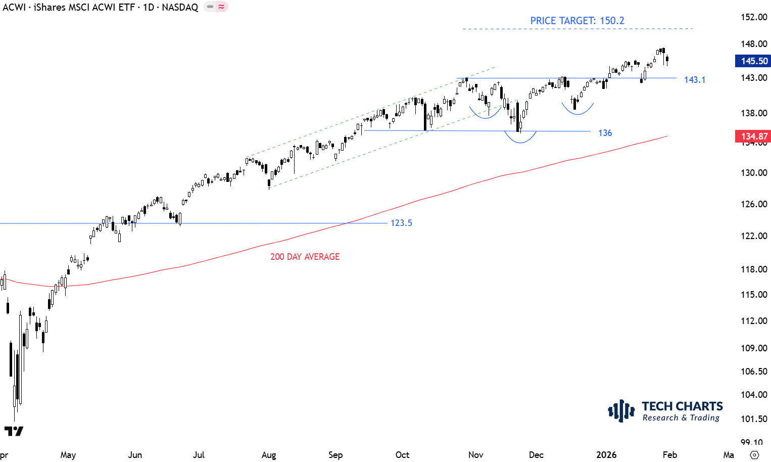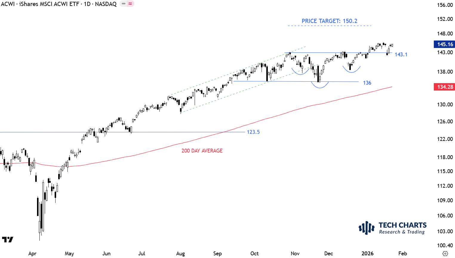 Read MoreThe benchmark for the Global equity markets performance, the iShares MSCI All Country World Index ETF (ACWI.O) after finding support at 136 levels and rebounding strong, found resistance at 143.1 levels. The sideways correction seems contained with the consolidation between horizontal boundaries of 136 and 143.1 levels. Breakout from the sideways consolidation is now resuming the uptrend. The benchmark completed a H&S continuation with the breakout above the horizontal resistance at 143.1 levels. H&S continuation price target is at 150.2 levels. Previous resistance at 143.1 becomes the new support.