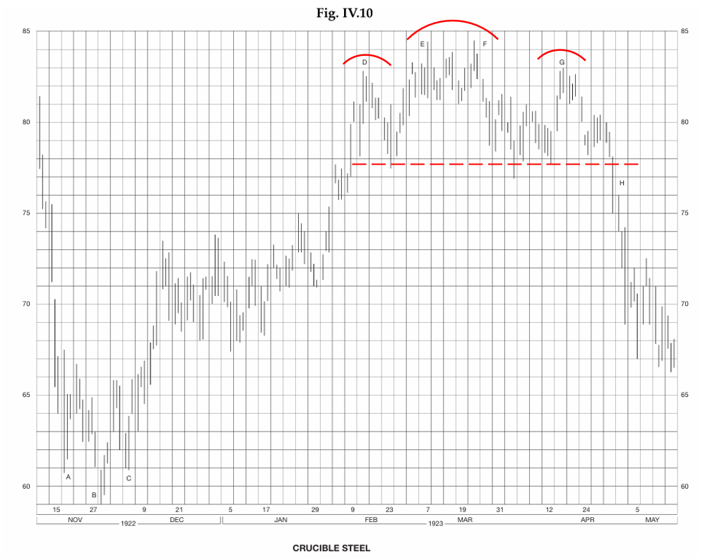 We have noted in our introduction to the Complex patterns that they are not common; ideal formations, perfect in every respect, are indeed extremely rare. We may, therefore, be pardoned if we go back in the files for a classic example in order to give our readers a first look at this interesting formation. Incidentally, this illustration serves also to point the fact that previous bull market produced the same technical pattern we found in 1929, and are finding today. Figure IV.10 shows the price action in Crucible Steel from November, 1922 to May, 1923. (A reference to the long-term chart of the Dow-Jones Industrial Average at the beginning of this Course shows that a general reversal in the market occurred at this time.) In November, 1922, Crucible Steel after a rapid drop down to 60 from above 80, reversed its trend with a perfect Head and Shoulders pattern of the ordinary type at A-B-C. Thereafter the stock worked up in a few months to 82 at point D, where it met resistance and formed the left shoulder of our Double Head and Shoulders Top. After a brief reaction the stock succeeded in getting up through that one previous point of resistance but was again stopped dead on two successive occasions, points E and F, at the 841/2 level. The stock backed away once more from the double head and, finally, staged one more rally to point G, the right shoulder, in a vain effort to renew the advance. But selling pressure was now too strong; the technical balance had definitely changed and, at H, the neck-base line was broken and the reversal formation was completed.