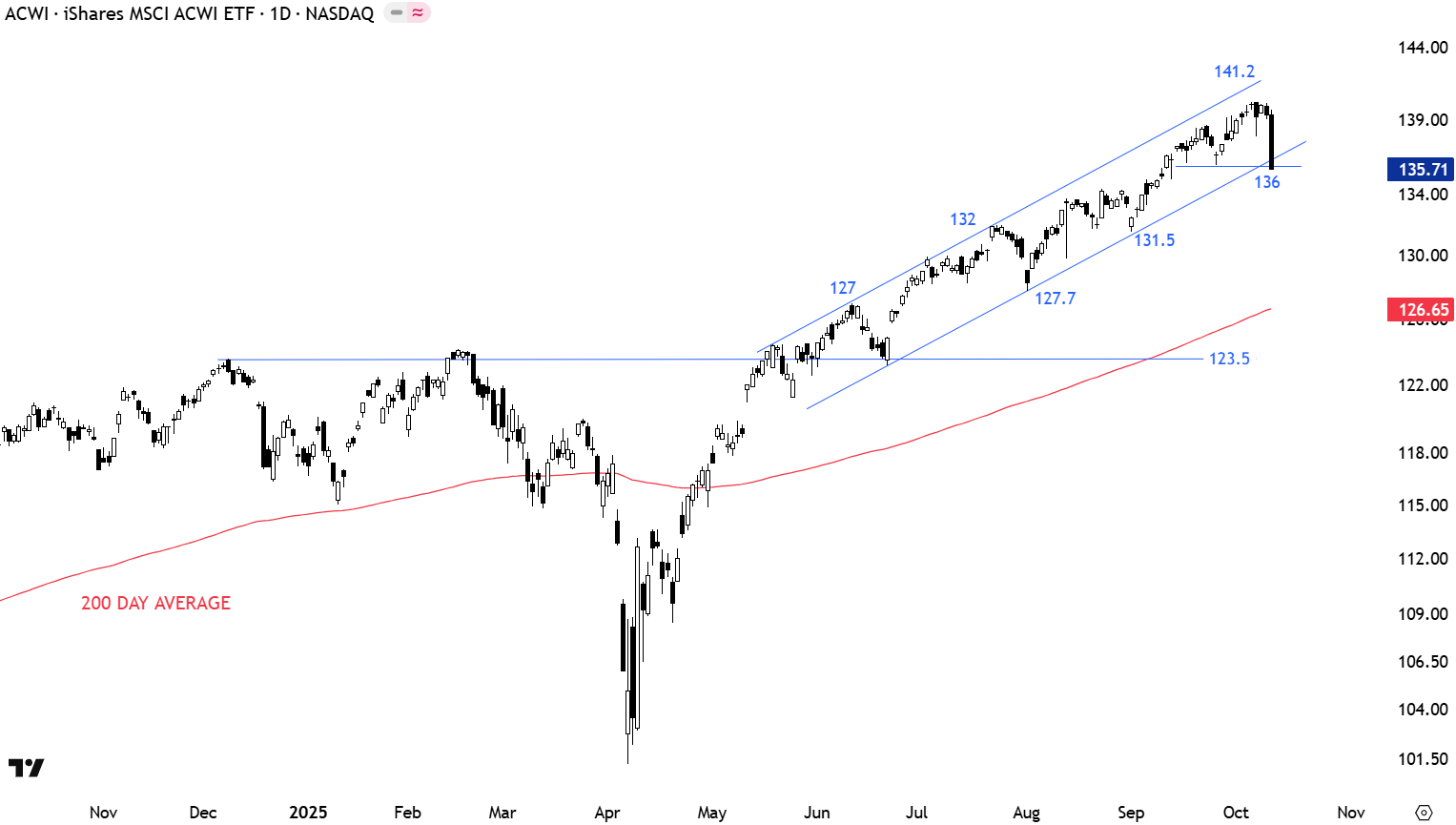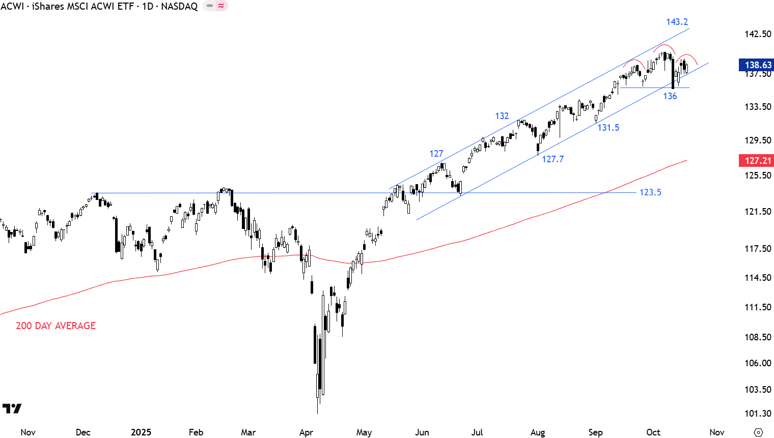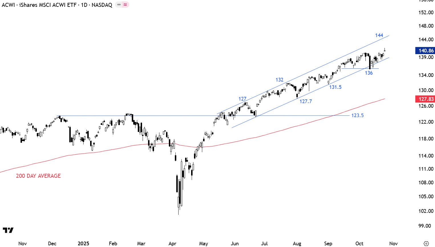 The benchmark for the Global equity markets performance, the iShares MSCI All Country World Index ETF (ACWI.O) continues to remain in the trend channel and resuming its uptrend. Breakdown of the channel can result in a reversion to the mean. The upper boundary of the trend channel can act as resistance at 144 levels. Lower boundary of the channel and the minor low form support area between 136-139.