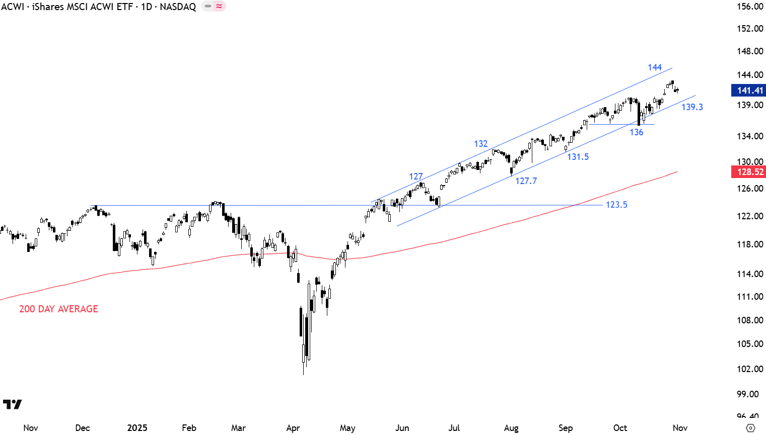 The benchmark for the Global equity markets performance, the iShares MSCI All Country World Index ETF (ACWI.O) did a round trip after the sharp sell-off and reached its all-time highs around 123.5 levels. Following the breakout above the horizontal resistance at 123.5 levels the ETF has been trending higher in a channel. Price is respecting both boundaries. Support area is between 135 and 131.5 levels. Uptrend is intact. The upper boundary of the trend channel can act as resistance around 139.3 levels. The lower boundary of the trend channel can form short-term support at 135 levels. Long term average is now overlapping with the horizontal support around 123.5, forming an inflection point.