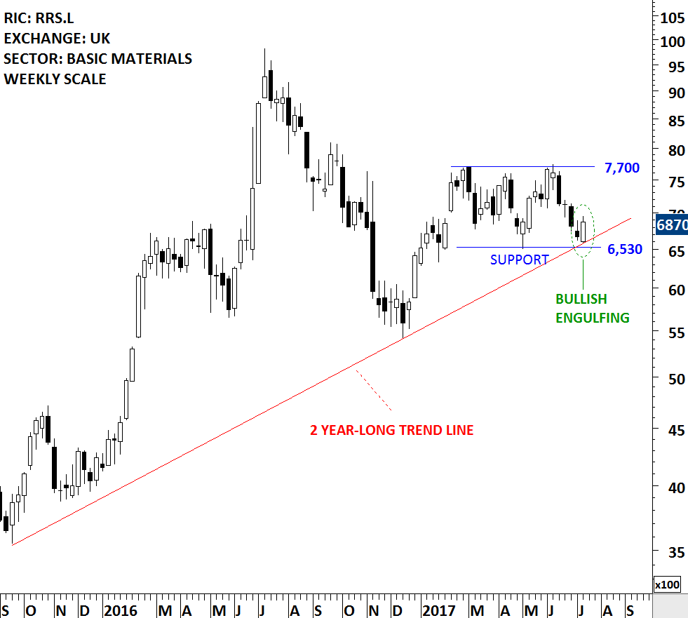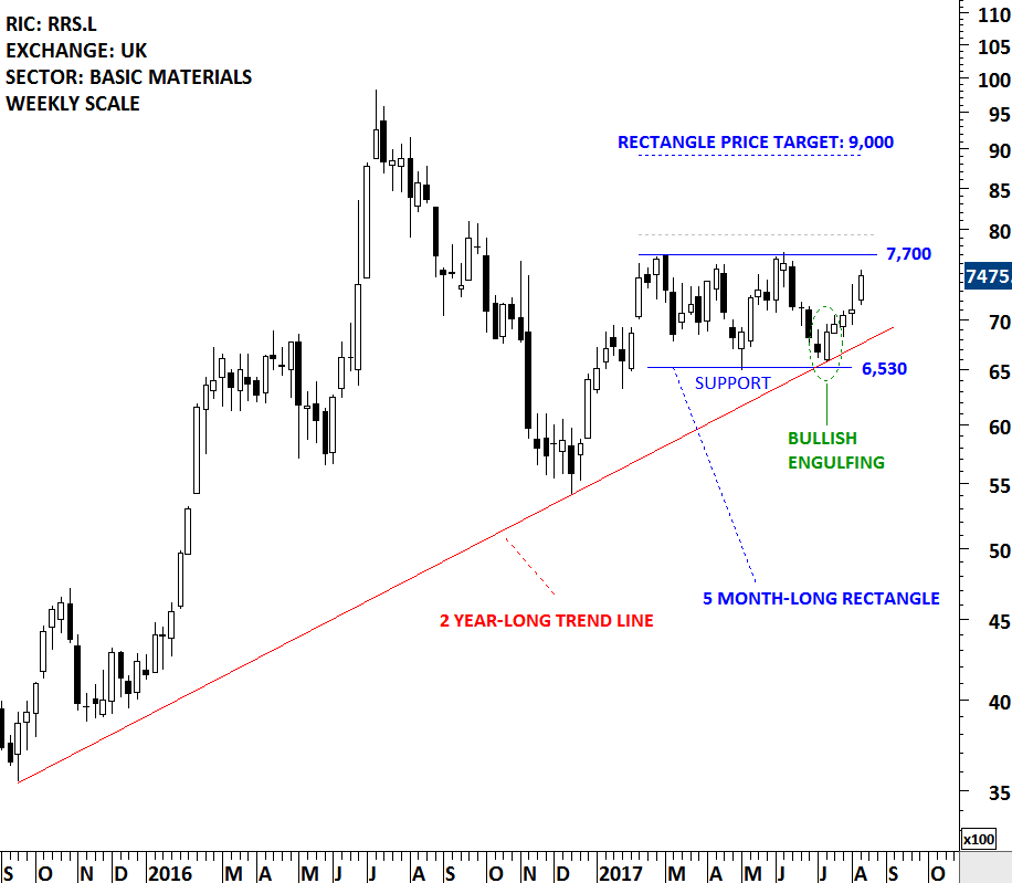 Another Bullish Engulfing candlestick formed on RANDGOLD in the beginning of July. The 2 year upward trend line and the lower boundary of a possible rectangle chart pattern met at the same price level (6,350). The formation of a Bullish Engulfing candlestick increased the likelihood of a possible rebound. RANDGLOD is possibly forming a 5 month-long rectangle that can act as a bullish continuation chart pattern.