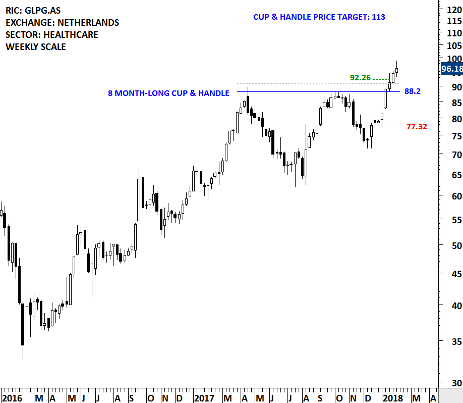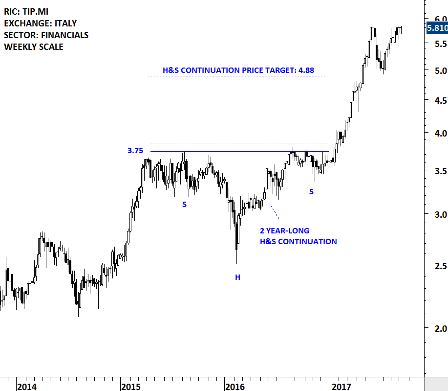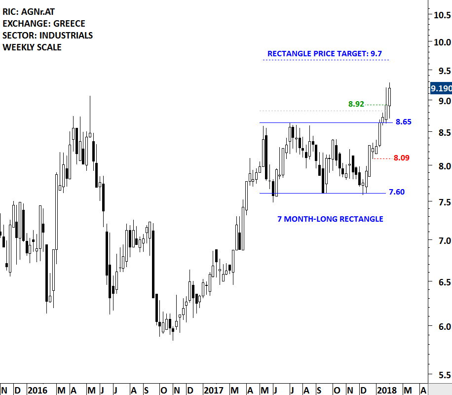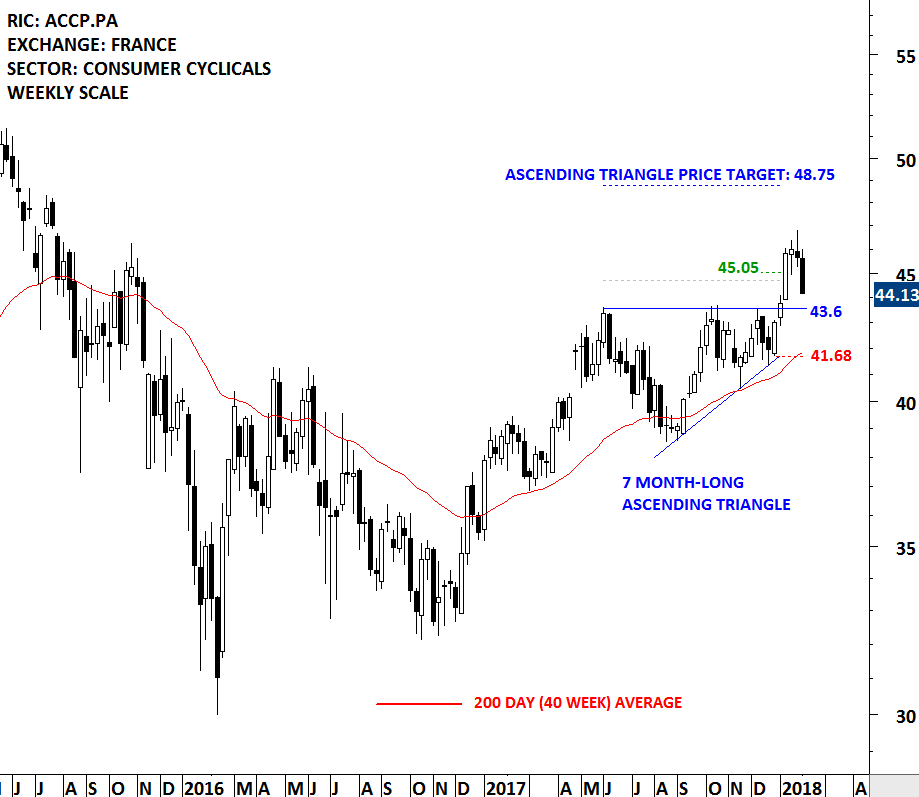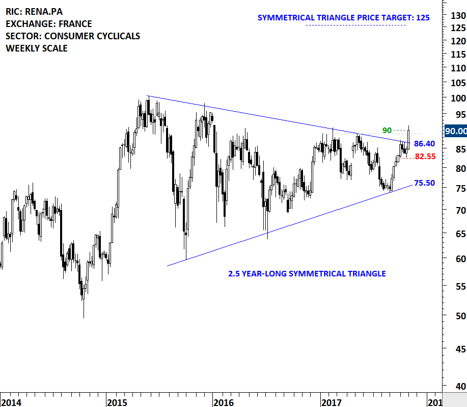 This week’s strong weekly price action on RENAULT SA completed a multi-year symmetrical triangle. On the daily scale chart the breakout took place with a gap opening above the multi-year trend resistance. We can possibly identify the gap as a breakaway gap which could have significant long-term implications. Breakaway gaps are rarely filled and they usually signal a change in trend.