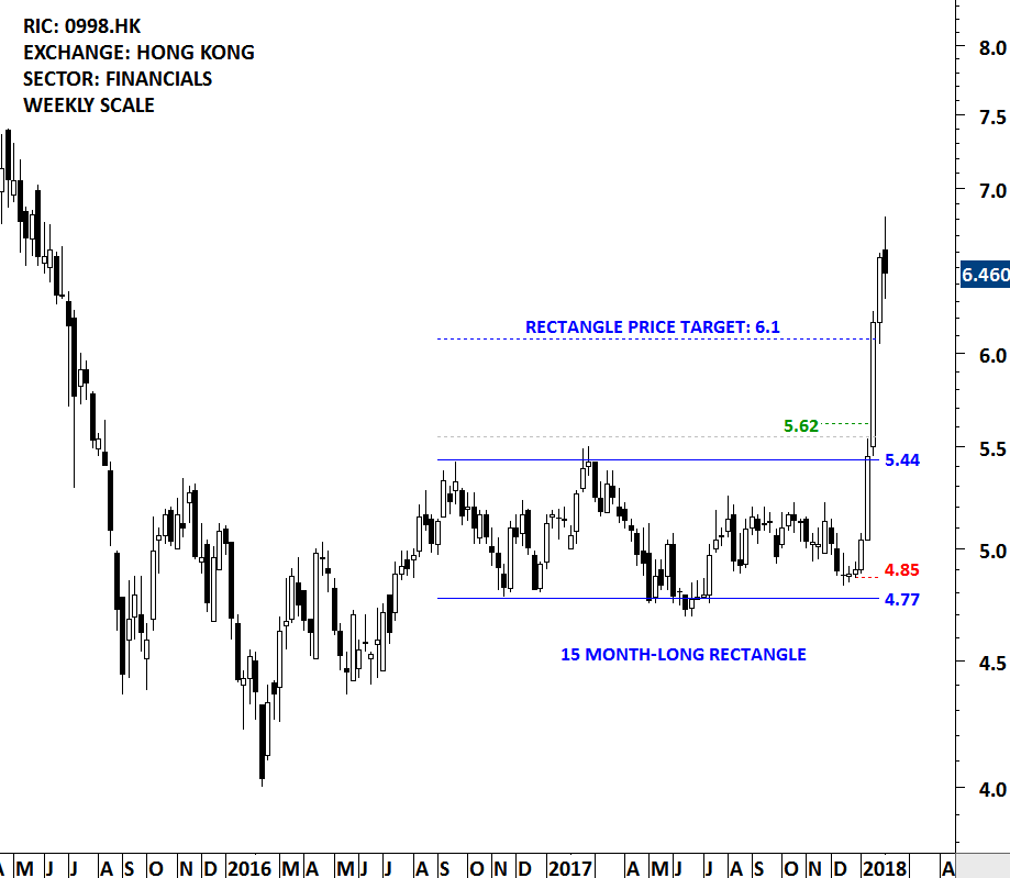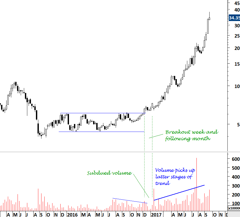 I classify volume indicator as “good to have”. It is “good” to see an increase in volume during a breakout. However, it is not a “must”. A breakout from a well-defined lengthy trading range can take place with low or “average” volume. This should not put the breakout in question. It is possible for the volume to pick up at the latter stages of the uptrend. Ignoring a genuine breakout because of low volumes can result in a missed opportunity. Below is a great example studying the volume pattern during a major breakout that took place on SUNAC CHINA HOLDING. Price completed a year-long rectangle with a strong breakout. Given the length of the consolidation and the magnitude of the breakout, the volume at the breakout and the weeks following the breakout was not significant. Only after the trend accelerated in the first part of 2017 that the volume started increasing. This is only one example and can’t be generalized for all breakouts. However, it is a good case study highlighting the importance of price action as the leading indicator.