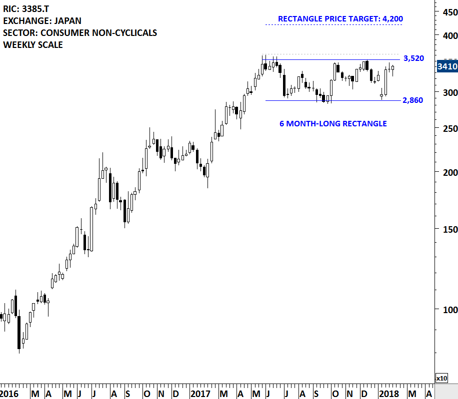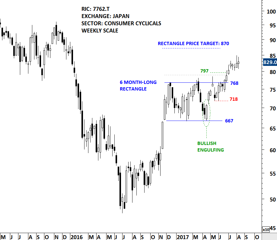 CITIZEN WATCH was discussed in April 2017 when the price formed a Bullish Engulfing pattern at a major support. The horizontal support proved to be the lower boundary of a rectangle continuation chart pattern. At the time, the rectangle formation was at its early stages and not clearly identifiable. However, the formation of the bullish reversal candlestick at the support increased the likelihood of a rebound. Bullish Engulfing candlestick is reliable when it forms at a strong support area.