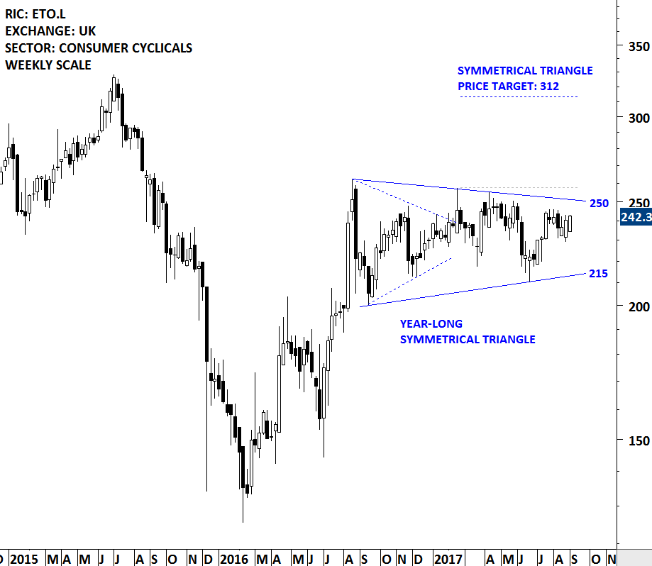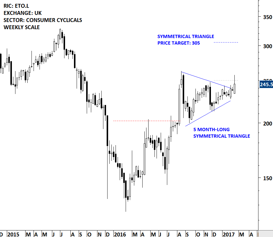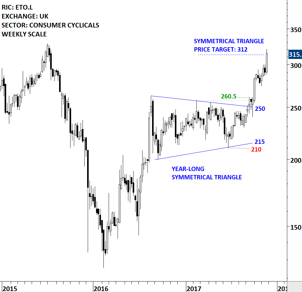 A good example is a stock the weekly report covered in the first quarter of 2017. Entertainment 1 is listed on the London Stock Exchange. Following the sharp rally that started in July 2016, price chart formed a 5 month-long sideways consolidation that, at the time of analysis, could be identified as a bullish flag/pennant or symmetrical triangle (continuation chart pattern). The breakout from the sideways consolidation failed to materialize into a steady uptrend and the stock continued to move sideways for another 6 months. In other words the chart pattern morphed into another form.