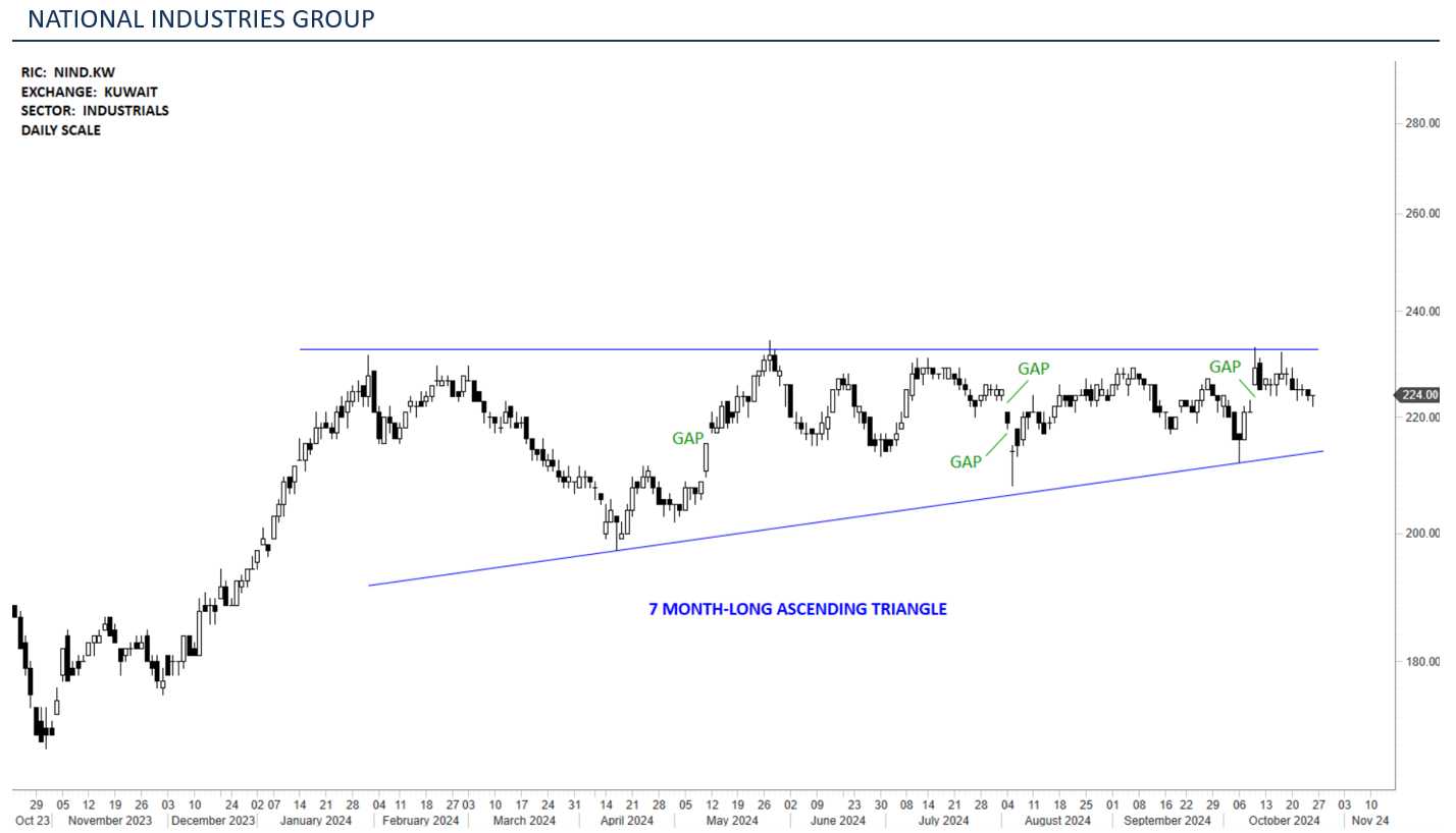 The chart above shows NATIONAL INDUSTRIS GROUP daily scale price chart between November 2023 and October 2024. The stock is listed on the Kuwait Stock Exchange. Price chart formed a possible 7 month-long ascending triangle. Inside the well-defined consolidation we can see several gap openings which were immediately filled. They have limited forecasting value, other than the knowledge that they will get filled somehow. Such information can become the basis of a short-term trading strategy.