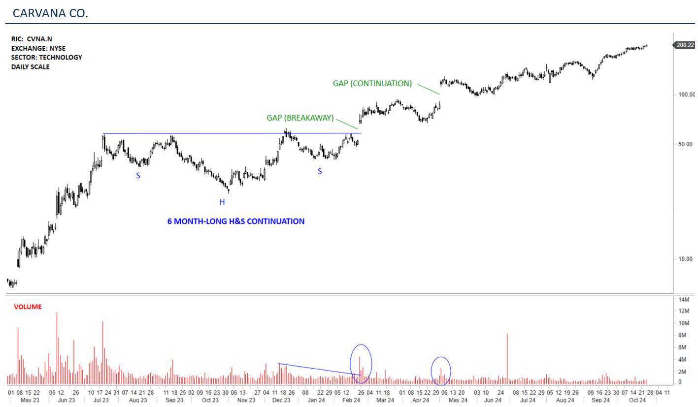 The chart above shows CARVANA CO. daily scale price chart between May 2023 and October 2024. The stock is listed on the New York Stock Exchange. After a strong uptrend between May 2023 and July 2023, the stock entered into a lengthy consolidation. The 6 month-long sideways price action was identified as an H&S continuation chart pattern. Breakout form the pattern’s horizontal neckline took place with a gap opening. The gap was a breakaway gap that was followed by a continuation/runaway gap. While the latter gat filled, breakaway gap was not filled during the pullback in April 2024.