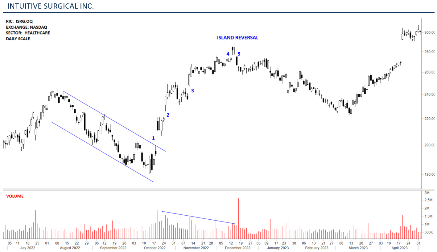 The chart above shows the daily scale price action of INTUITIVE SURGICAL between July 2022 and April 2023. The stock is listed on the Nasdaq Stock Exchange. Labelled on the chart are 5 different gap openings. Gap that is labelled 1 was a breakaway gap that reversed the downtrend of Aug-Sep 2022 with a breach of the upper boundary of a downward trend channel. Gap 2 and 3 were clearly the continuation/runaway type which resumed the existing uptrend. As the trend matured, volume declined, showing a divergence between the price and volume. Non confirmation was followed by one last gap (GAP 4) in the uptrend which was identified as an exhaustion gap. After 2 days of price action which formed the island another gap this this one the downside formed out of the island consolidation area. With that we have the island reversal pattern confirmed and a forecast made for further development of a downtrend.