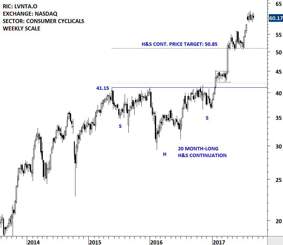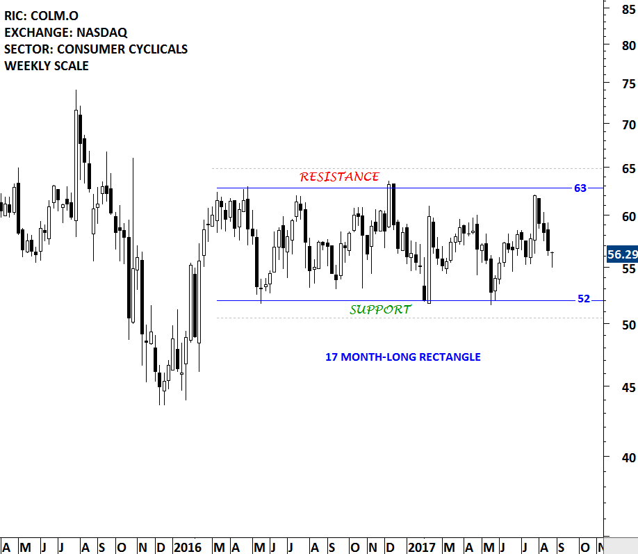 Another good example for a well-defined trading range is the price chart of Columbia Sportswear. The multi-month trading range on Columbia Sportswear was discussed in the May 27, 2017 report. The analysis drew attention to a possible rebound from the lower boundary (support) of the 17 month-long range at 52 levels to the upper boundary at 63 levels. Columbia Sportswear price continues to remain between the boundaries. Tech Charts Global Equity Markets report will continue to bring member’s attention such chart pattern developments as well as breakout opportunities.