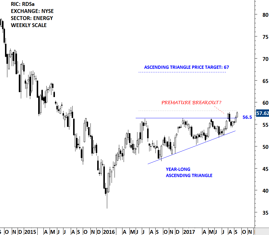 In the first week of August, price of Royal Dutch Shell breached the upper boundary of a year long ascending triangle at 56.5 levels. In the following week, it reversed back into the chart pattern. After spending few weeks inside the chart pattern boundaries, the stock gained momentum and is now challenging for the second time the upper boundary of the bullish continuation chart pattern. A confirmed (secondary breakout) can complete the bullish continuation chart pattern with a possible price target of 67 levels. Royal Dutch Shell might be a good example to apply the concept of premature breakout to chart patterns. For false breakouts (bull & bear traps) you can refer to the U.S. Dollar Index chart in the review section of this report.