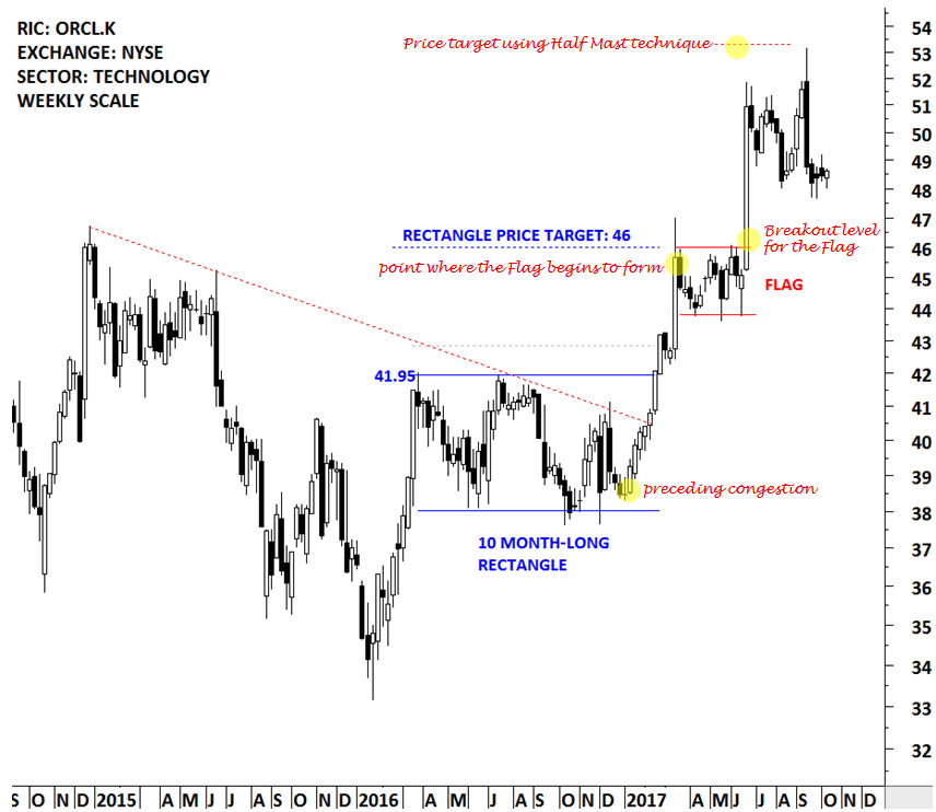 Please note that on weekly scale price charts, depending on the length of the previous chart pattern, I label a 2-3 month-long tight consolidation a flag. These consolidation periods are shorter than a rectangle. Below you will find two examples discussing different levels during the formation of a flag and the possible price targets that are calculated following the breakout.