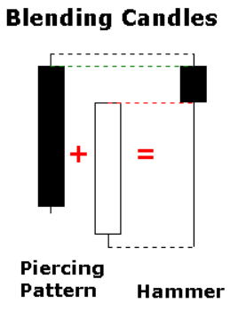 Candlestick patterns are made up of one or more candlesticks and can be blended together to form one candlestick. This blended candlestick captures the essence of the pattern and can be formed using the following: The open of the first candlestick, the close of the last candlestick and the high and low of the pattern. By using the open of the first candlestick, close of the second candlestick, and high/low of the pattern, a Piercing Pattern blends into a Hammer. The long lower shadow of the Hammer signals a potential bullish reversal.