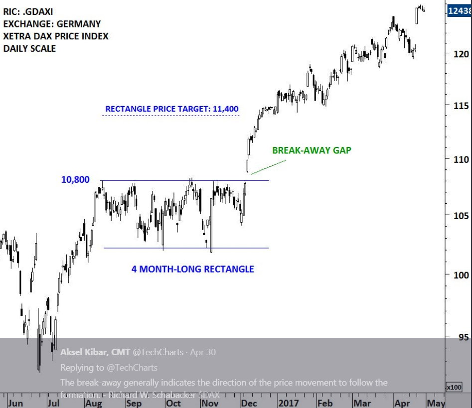 The breakout on the daily scale price chart of RENAULT SA reminded me of a similar, though shorter-term breakout that took place on the Germany DAX Index. The breakaway gap that took place in the beginning of December 2016 was not filled. The breakout from the well-defined consolidation range was followed by a strong trend period.